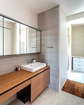幅広いカウンターと置き型ボウルを組み合わせた洗面スペース。奥にはランドリースペースや脱衣室などの水回りが続くことで便利な生活動線でありながら、扉を閉めると各スペースが独立するので、家族がそれぞれの用事を気兼ねなく済ませられます。
