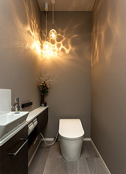 グレイッシュなミディアムトーンの壁が落ち着きをもたらすトイレ。ペンダントライトのインパクトある明かりが無地の壁に印象的な柄を描き、アクセントとなっています。