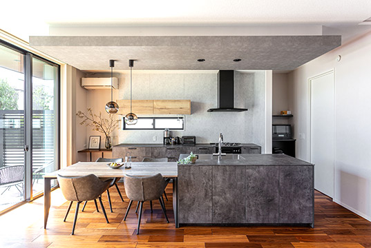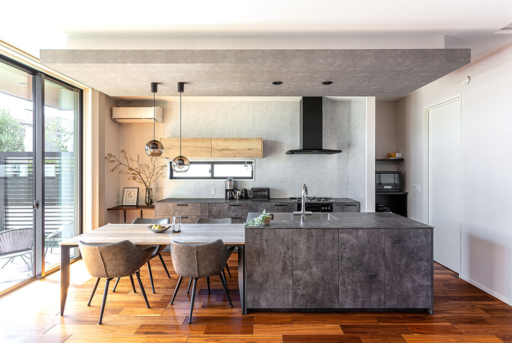 大開口、ダイニング、キッチンが一直線上に並ぶことで、キッチンに立つとLDK全体と庭が見渡せます。料理をしながら庭に出入りして遊ぶお子さまの様子が見守れるので安心です。アイランドキッチンは作業スペースが広々と使え、食材を広げながら快適に料理ができます。