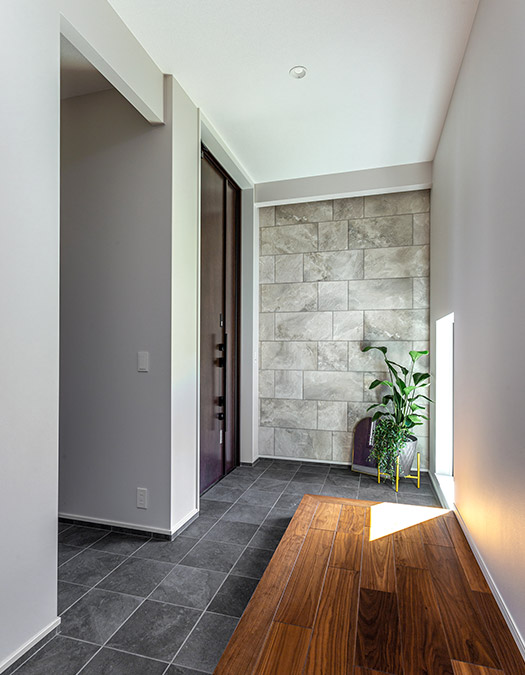 玄関に入ると、すぐ正面の低い窓から庭の様子が覗えます。2方向からリビングにつながり、左手の家族が出入りする動線は大容量の収納スペースに続きます。また、上がり框がL字型になっていることで出入りできる幅が広く取れ、大人数のゲストを招いた際はスムーズに室内に通せます。
