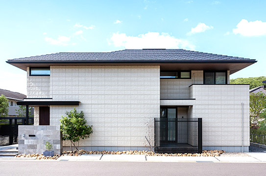 ファサードの窓を絞り、広い壁面を見せた外観。「実物件をいくつも見学して選んだベルサイクス外壁は、光によって陰影が出て、重厚感があり気に入りました」と、Tさま。中庭やバルコニー上は軒の出を深く取り、奥行を加えることで広い壁面とメリハリをつけています。