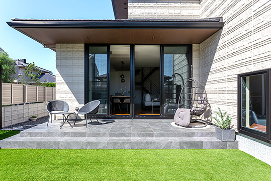 高さのあるフェンスで目隠しした、プライベート感漂う広々とした庭。LDKから気軽に出入りできるので、心地よい外空間が自然と暮らしに溶け込みます。深く張り出した軒が、強い日差しや雨からテラスや室内を守ります。