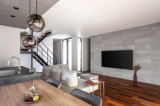 リビングの奥、L字に配した窓は中庭に続きます。こちらは光や視線の抜けをもたらすライトコートです。日中は中庭に入る優しい光がスケルトン階段やリビングにあふれ、夜間はライトアップすることで間接照明のような柔らかい明かりが室内を照らします。また、テレビを設置したデザインウォールの裏は大容量の収納スペース。お子さまのおもちゃなどをスマートに隠しています。