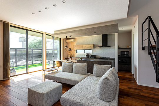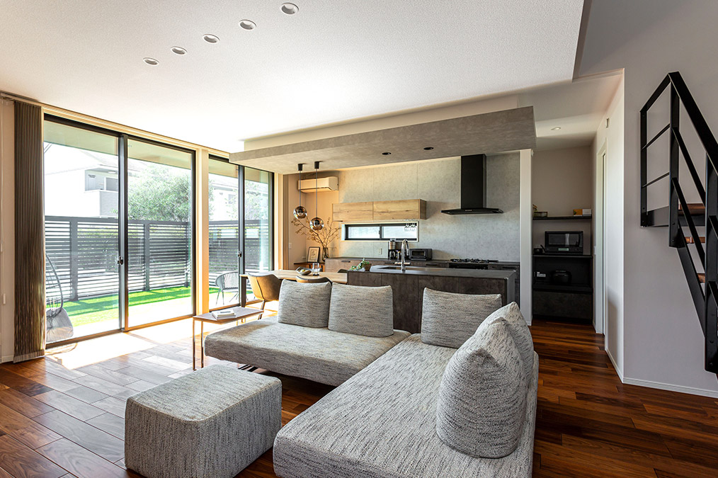 ウォルナットの床材が木目の温かみと上質感を与えるLDK。大開口から出るとタイルテラスが連続し、その先には高いフェンスで囲むことでプライバシーに配慮した庭が続きます。お子さまが出入りしながら遊ぶ姿をキッチンから見守ったり、外に気軽に出て寛ぎの時間を過ごしたりと、外空間の心地良さを気軽に暮らしに取り込めます。