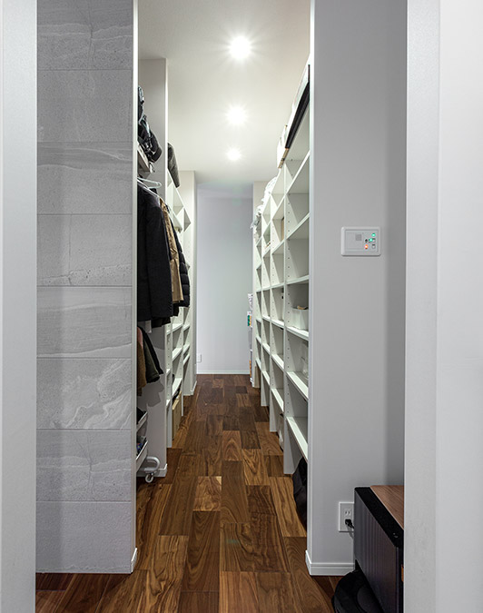 リビングのデザインウォール裏にある、ウォークスルーできる収納スペースです。リビングに散らかりがちな書類関係や、お子さまのおもちゃがすぐに仕舞える便利さと、表に収納の存在感が出ないのがポイント。玄関とつながる帰宅動線上にあるので、上着やバッグなど外出時に使用する物もここに片付けられます。