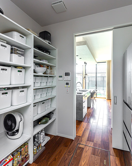 キッチンと一直線上に並ぶパントリー。食品や飲み物のストックなどが入る大容量で、扉を閉めるとキッチンと分離できます。「冷蔵庫はパントリー内に設置しました。不便でないか心配でしたが、普段は扉を開放しているので使い勝手に支障はなく、LDKがすっきり見えてよかったです」と、Tさま。