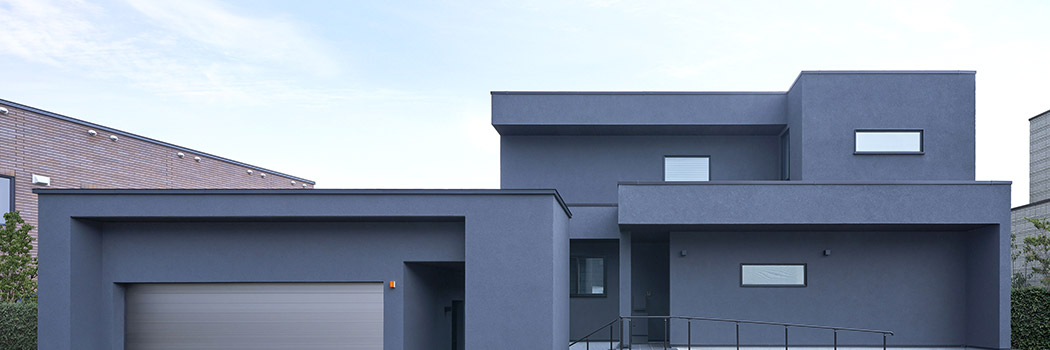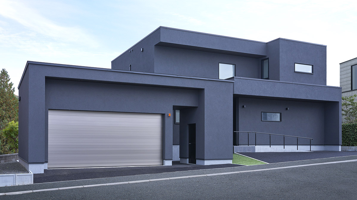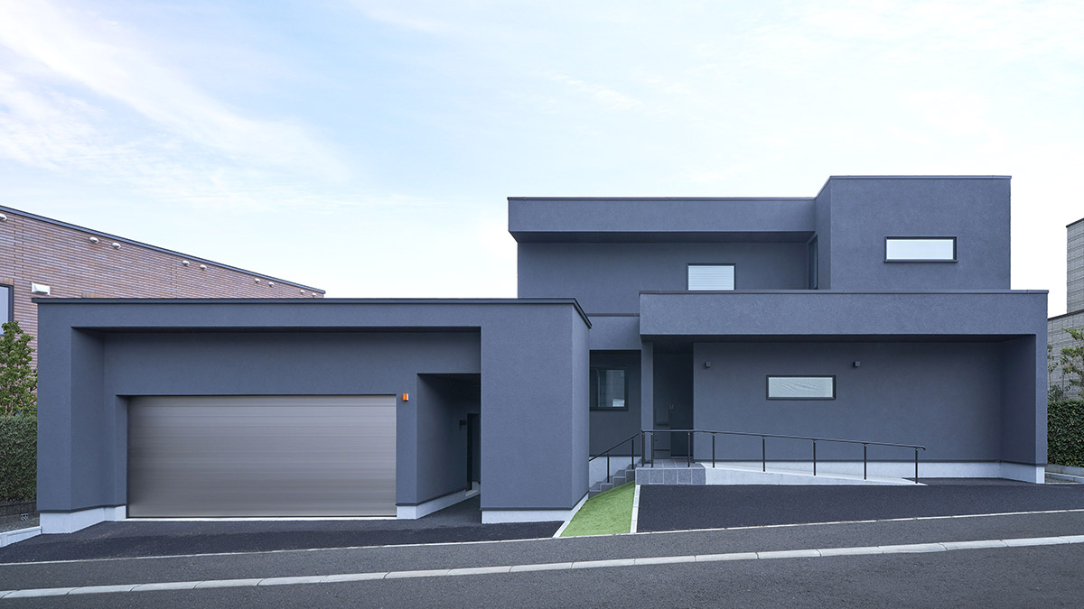 グレートーンでまとめた外観は、色数を抑えたからこそ奥行きと風格が際立ちます。外壁には塗り壁を採用し、シンプルでありながらも豊かな陰影を宿した上質な表情に。凹凸が織りなすリズム感と雄大なシルエットが調和したたたずまいは、行き交う人々を魅了します。