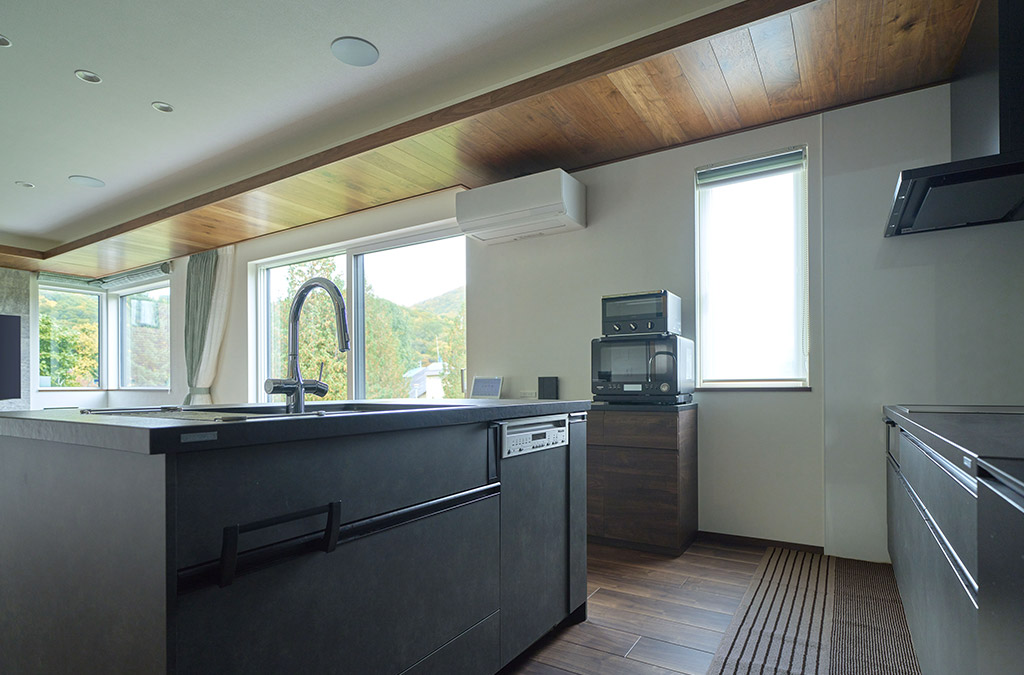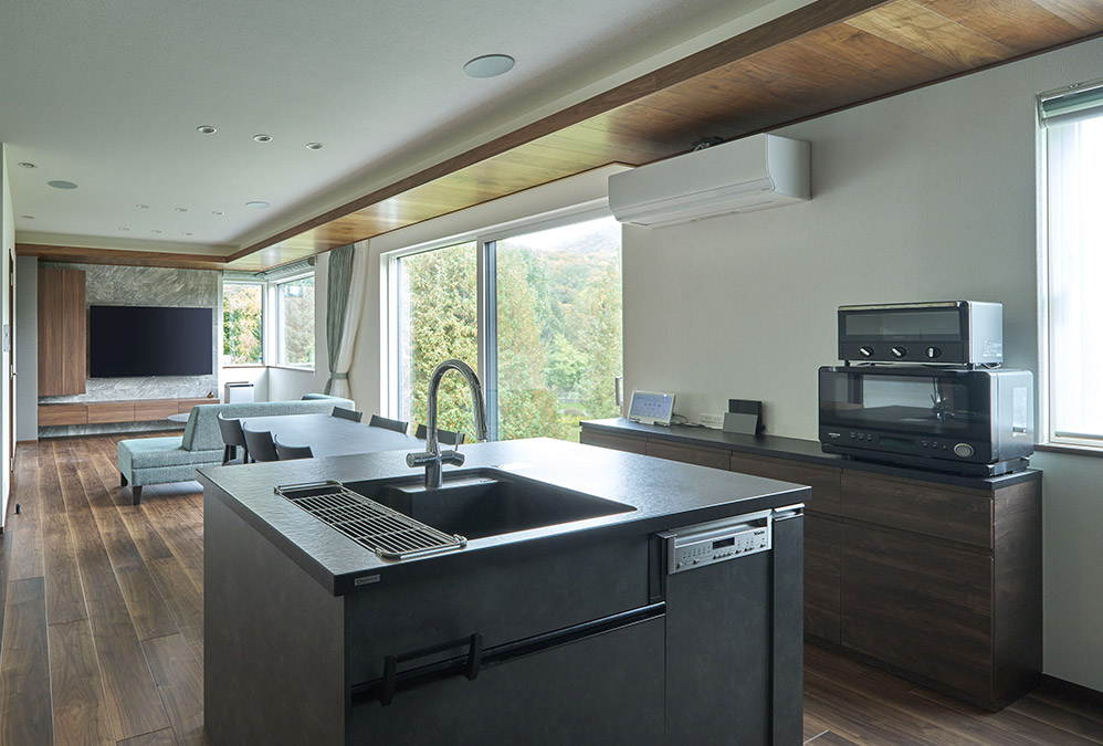 動線が短く、作業効率の良い二の字キッチン。シックなダークトーンにまとめることで、洗練された家具のように端正な存在感を放ちます。調理をしながらでも家族とつながり、大開口を通して季節の景色を愉しめます。