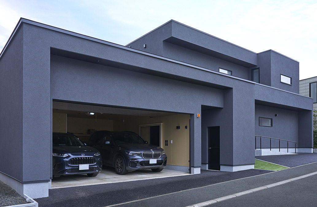 2台収容のビルトインガレージは、外観に重厚感をもたらす存在。内部はゆとりある広さを活かし、収納スペースとしても活躍。裏手にはプライバシーを確保したテラスが隣接し、扉を通してシームレスにつながります。バーベキューコンロなどの出し入れもスムーズにでき、休日にはゲストを招いて豊かな外時間を楽しめます。