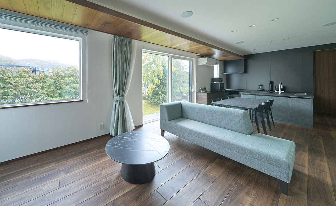 LDKがひとつながりになった伸びやかな大空間。大開口には断熱性に優れた樹脂サッシを採用しました。目の前に広がる自然を愉しみながら、寒冷地でも冬は暖かい暮らしを叶えます。空間に深みを添えるのは、ウォルナットの床材と折り下げた木の天井。外の景色とも響き合い、上質な時間を演出します。