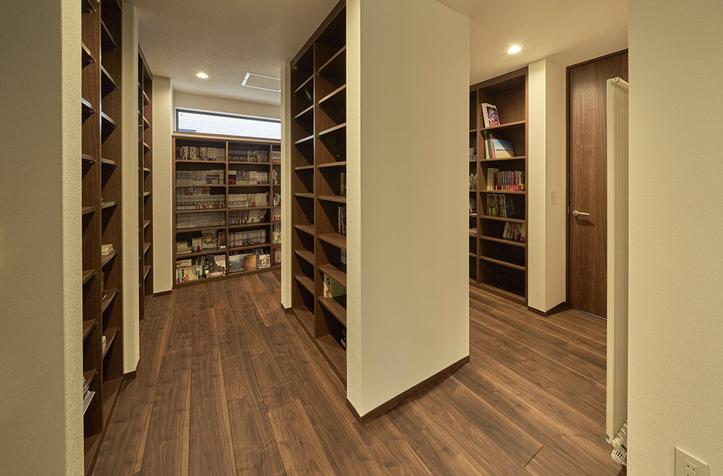 本好きのオーナー様の想いに応える、大容量の本棚を配したフリースペース。まるで小さな図書館が家の中にあるような空間です。あえて一室にせず動線の中に配置したことで、本がもっと身近な存在に。高窓からは柔らかな光が差し込み、ずっと居たくなるような心地良さに包まれます。