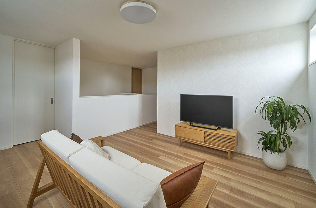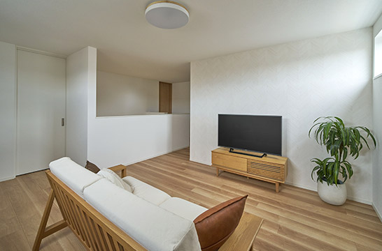 将来を見据えて、階段を上がってすぐの場所にセカンドリビングを配置。高窓は隣家の視線を巧みに遮りつつ、室内には伸びやかな抜け感を演出。テレビ側には柔らかな光がそっと導かれ、時とともに移ろう陰影も愉しめます。