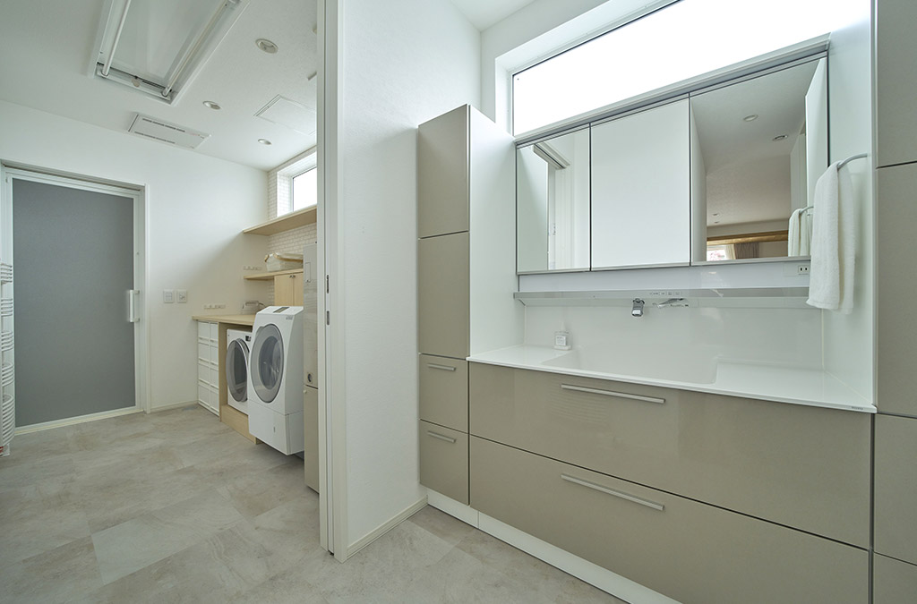 随所に機能美が息づく、広々としたサニタリー&ランドリールーム。LDKや玄関からスムーズにアクセスできる回遊動線によって、家事や身支度の負担を軽減します。清潔感と柔らかな落ち着きのある空間に仕上げるとともに、横長の高窓から射し込む自然光によって、日々のシーンはより明るく心地よくなります。