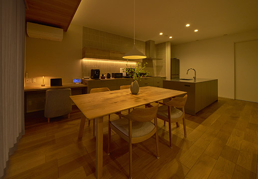 空間を柔らかく包み込む間接照明の光が木の温もりと響き合い、夜のダイニングはしっとりとした豊かな時間が流れます。収納棚の横にはワークスペースを設け、家事の合間に仕事や趣味に集中できる“小さな居場所”を用意しました。家族の時間も、自分の時間も満たしてくれます。