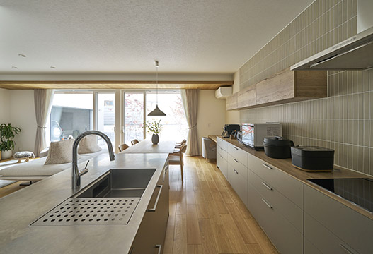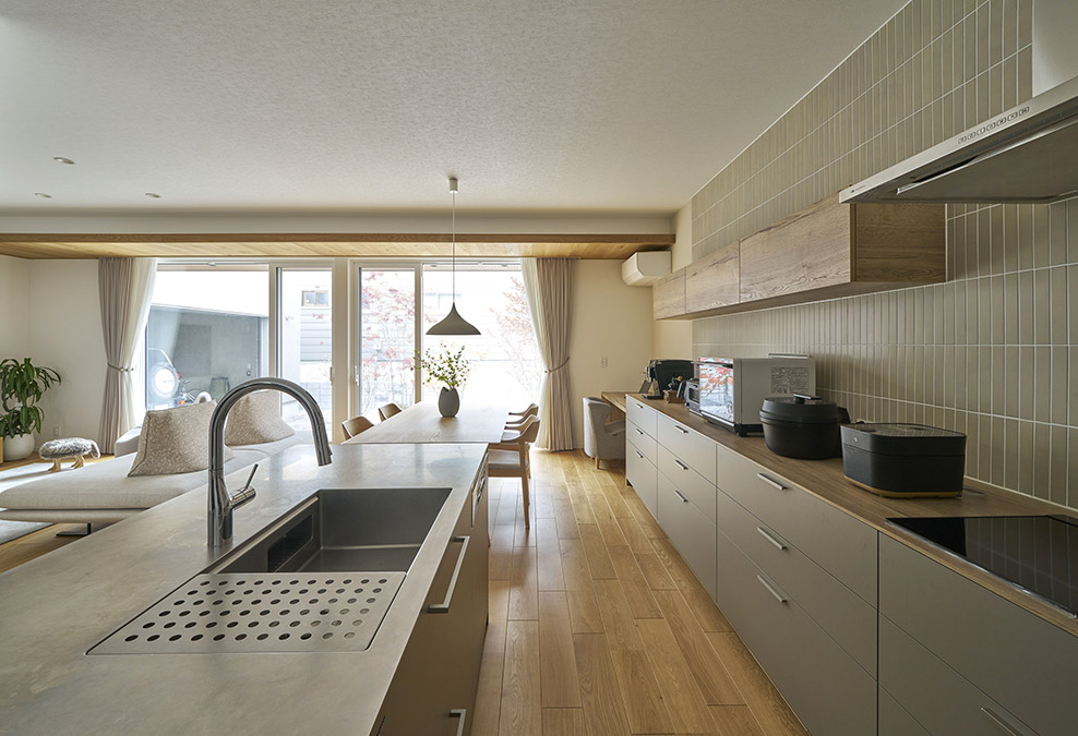 リビングとつながるキッチンはグレージュトーンに統一することで、空間に落ち着きをもたらす存在に。キッチンからダイニング、そしてお庭まで視線が抜け、調理中も開放感に包まれます。背面は木調のキッチンカウンターを採用し、天井や床のオークの風合いと美しく調和。暮らしに温もりと上質さを添えます。