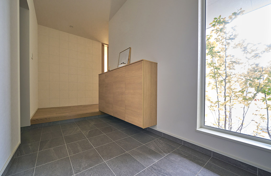 大きなピクチャーウインドウが緑、光、そして開放感をもたらし、住まう人を心地よく迎えます。土間空間を広くすることで洗練さをプラス。ホール正面の壁には質感豊かなエコカラットを採用し、柔らかな陰影を演出しました。土間収納ともスムーズにつながる設計で、すっきりと美しい玄関を保てます。