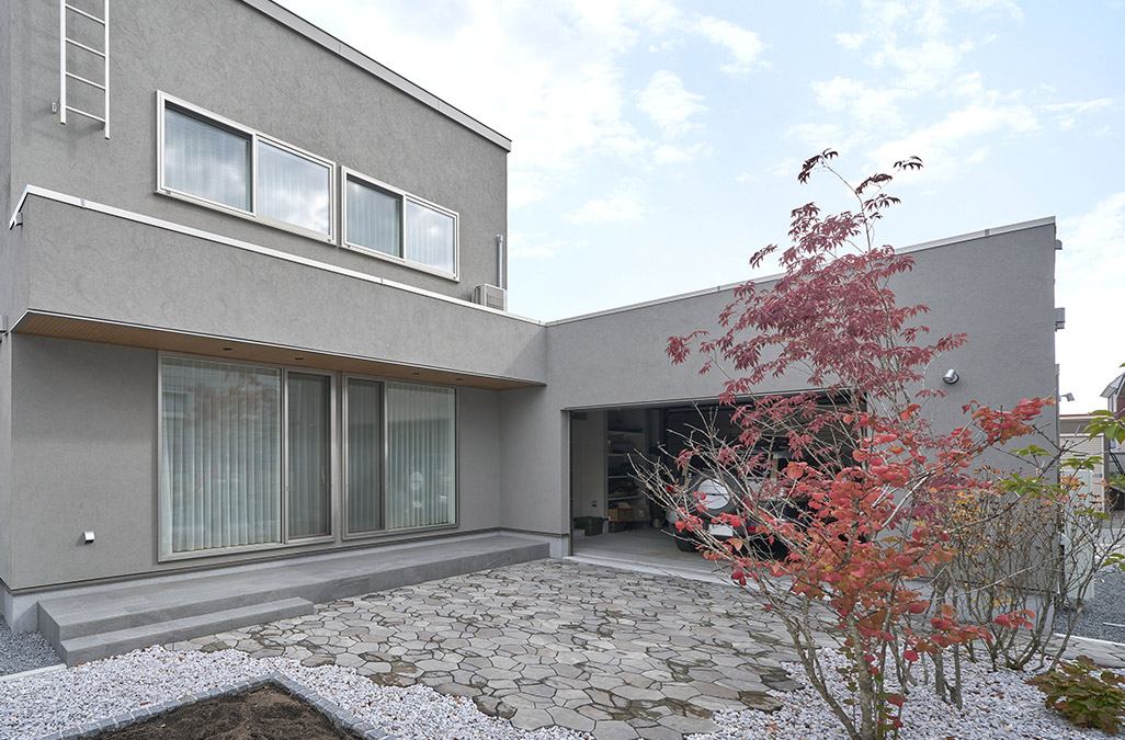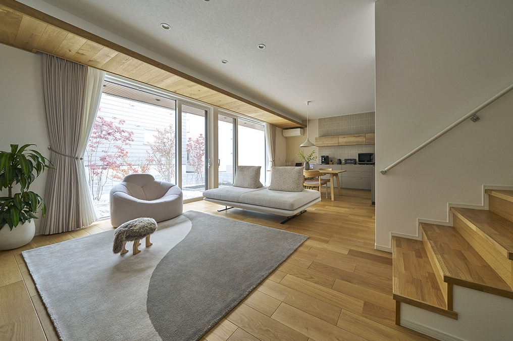 閑静な住宅街に凛とたたずむ木造2階建て。外にしっかりと閉じながらも、おうちの中にプライベートガーデンを配置しました。ご夫妻の共通の趣味であるアウトドアを心置きなく楽しめる大切な居場所です。プライベートガーデンとLDKは大きな窓を通して、内と外がシームレスにつながる心地よい空間を演出。北海道という立地だからこそZEH Oriented仕様の断熱性能を確保し、開放的でありながら冬でも暖かい暮らしをかなえます。さらに、将来の家族構成の変化にも柔軟に対応できるようプランニング。住まう人の暮らし方と響き合いながら、長く深く愛せる美邸がここにあります。