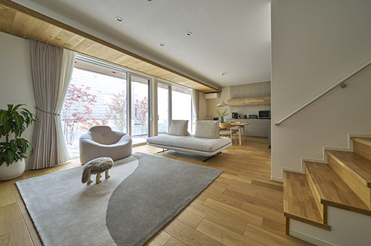 大開口のスライディング窓を通して、お庭と一体につながるリビング。視線は自然と外へと抜け、大らかな開放感に包まれます。木調の折り下げ天井と軒裏の素材感を揃えることで、内と外の調和を際立たせました。ナチュラルな木の温もりに抱かれながら、緑や光と寄り添って暮らせる“心地よさに満ちたリビング”です。