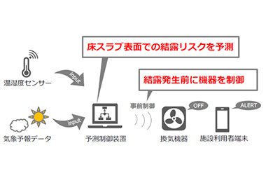 倉庫や工場において夏期の降雨時等に発生する床面結露を抑制するシステム