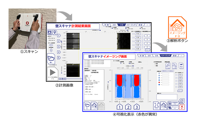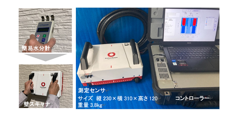 既存住宅の雨漏れ確認に従来用いられてきた簡易水分計は、機器と壁体に電気回路の形成が必要であるため、空気層(外壁で一般的な通気層など)を含む壁内の雨漏れの有無を検知できませんでした。壁スキャナは建材を透過・反射する電磁波を用いることで空気層を含む重厚な壁体であっても水分検知を可能にします。