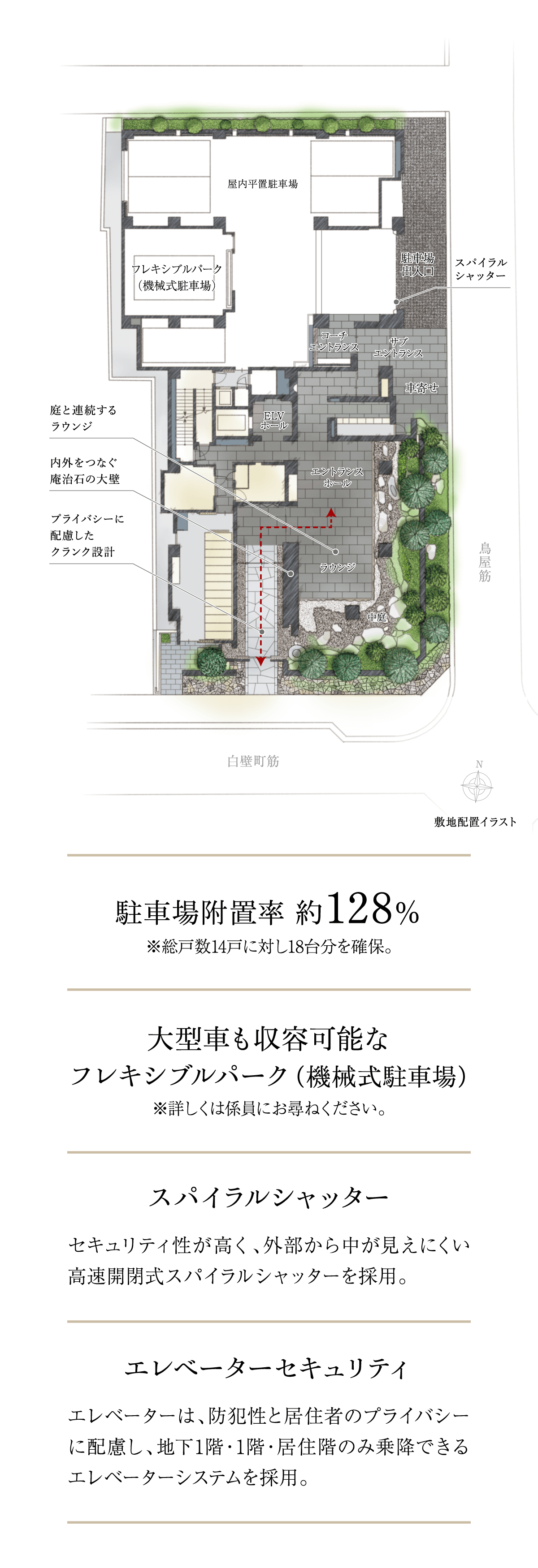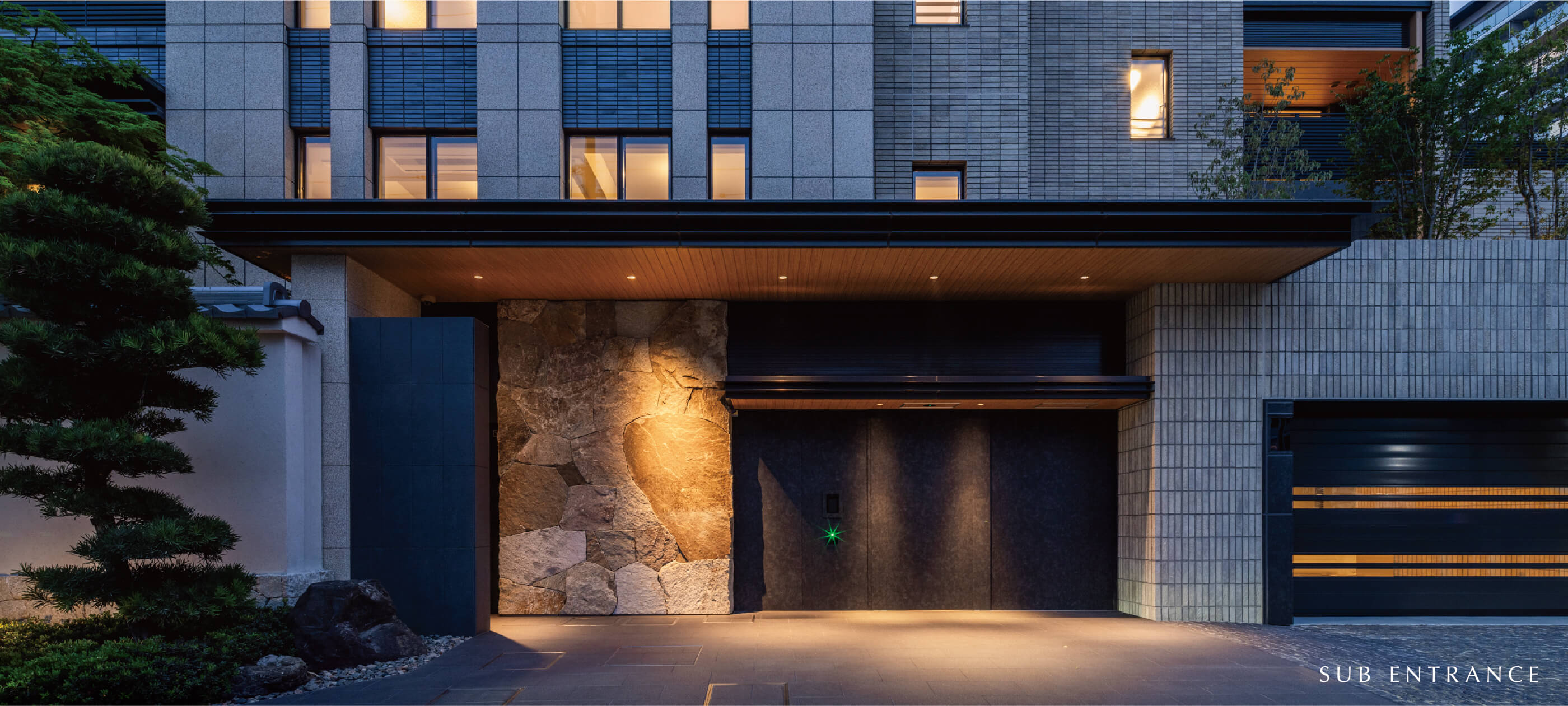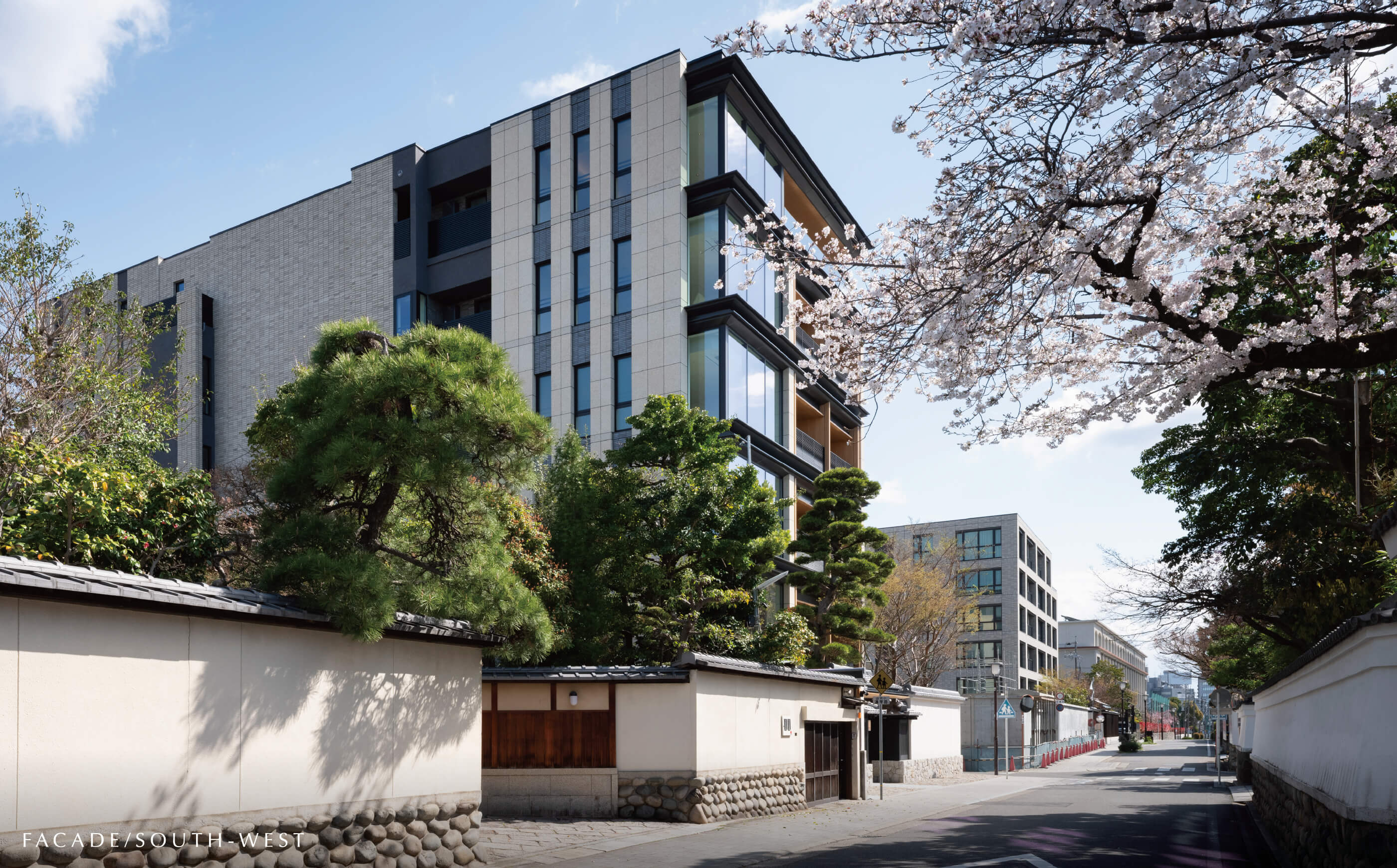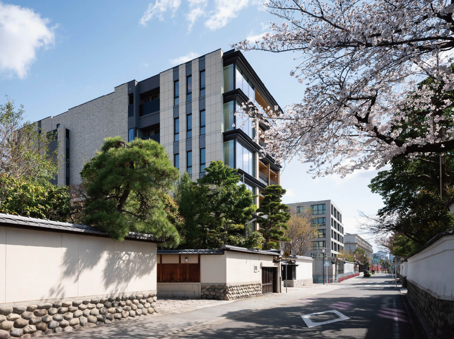 白壁の地に次世代に継ぐ新たな景色を生み出すために。武家屋敷の面影をしのぶ、歴史ある門・塀、緑からなる屋敷景観との調和を目指し、庵治石や三州瓦などの伝統素材を現代的ディテールによって再構築。歳月と共に深みを増してゆく、白壁町筋に新たな修景を創造します。