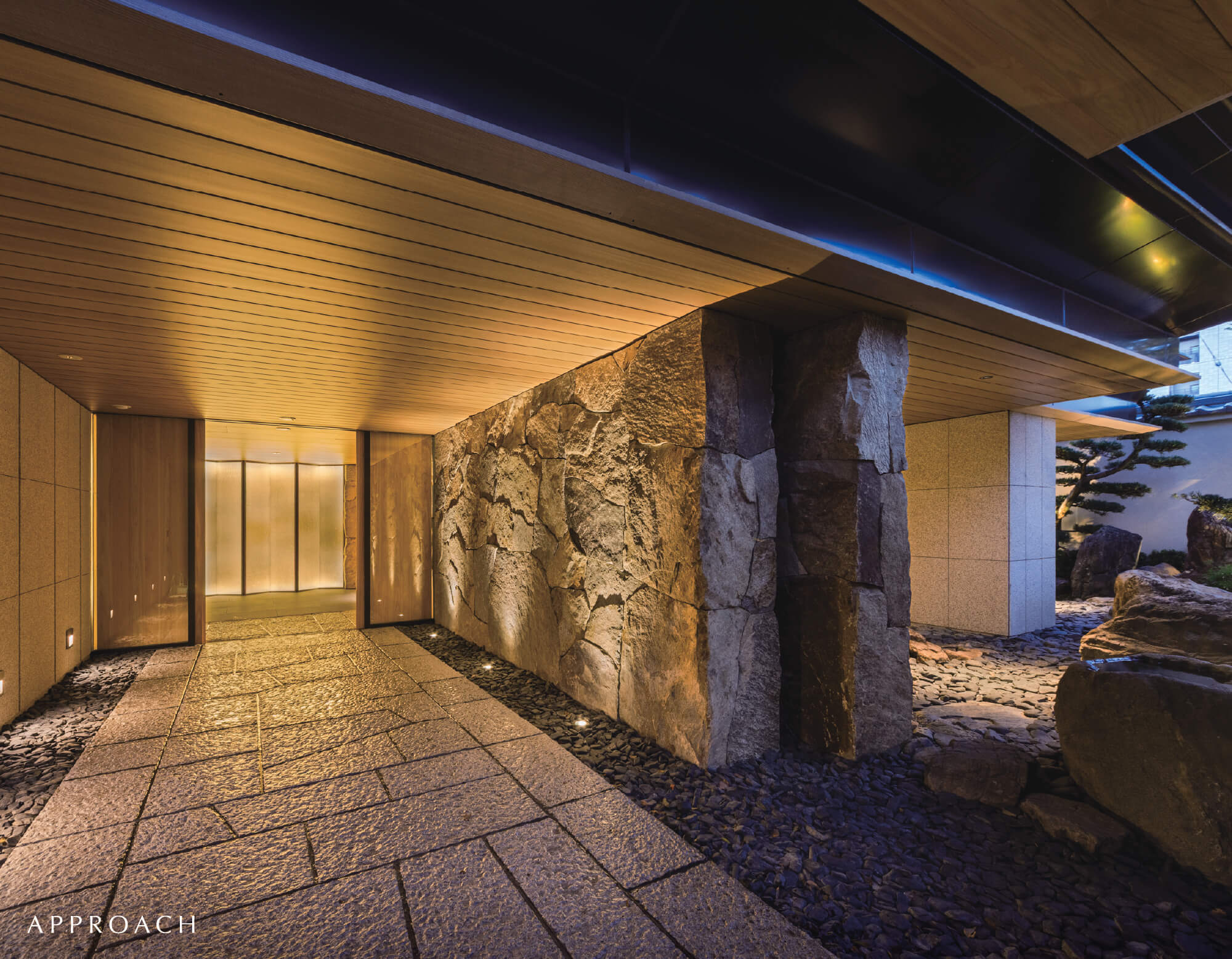 奥深い自然味に溢れる美しい石貼りの意匠。匠の丁寧な手作業により、一枚一枚から優美な表情が漂うタイル。日本の伝統美が織りなすマテリアルは、白壁の歴史景観に調和しながら、さり気なく厳かな存在感を醸しだす。