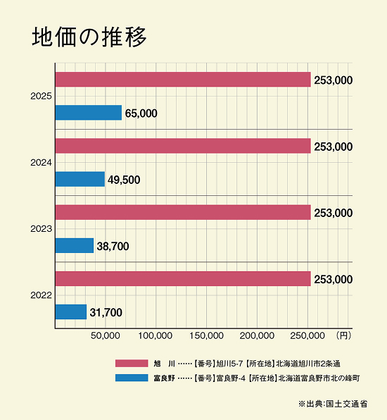旭川は全国的に見ても地価が安く、都市機能にもまだまだ発展の余地が残されています。富良野の地価が2年連続で上昇率1位となった事実は、旭川の不動産マーケットへの注目を一層高め、好影響をもたらすことでしょう。充実したアーバンライフを享受できる旭川と、豊かな自然を身近にリゾート気分を味わえる富良野。都市と自然という相対する二つの価値が交わるポジションから、北海道の新時代の暮らしのスタイルが生まれる未来を想像したいですね。旭川都心の可能性は、富良野とのつながりによってさらに拡がり、明るいものとなっていくと考えています。