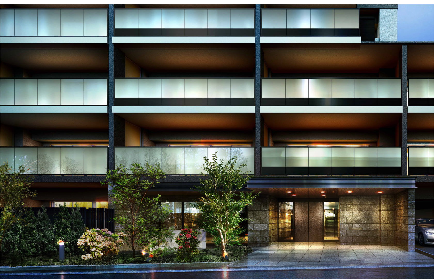 ガラスのバルコニー手摺がモダンさを奏でる、品格と質感溢れるファサードをデザインしました。