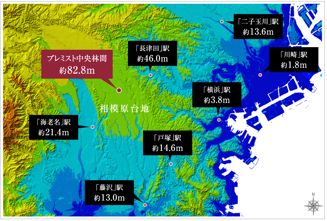 本プロジェクトは、標高約82.8mの高台にあり、地盤のしっかりとした地層が広がる相模原台地の上に位置しています。地震時の揺れが軽減される可能性があり、日々の暮らしに安心をもたらします。