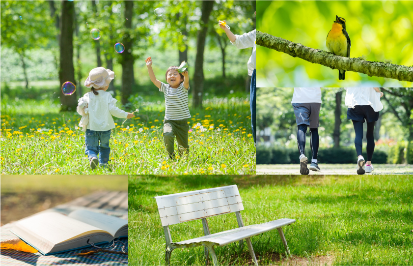 「みどりの森」「ひのきの散歩道」「仲よし広場」の3つのゾーンで構成され、四季折々の自然を感じながら散策を楽しめます。特に「みどりの森」は豊かな植生が魅力で、隣接する緑野公園と一体的に利用でき、サクラやクヌギの木々が季節ごとに美しい表情を見せてくれます。