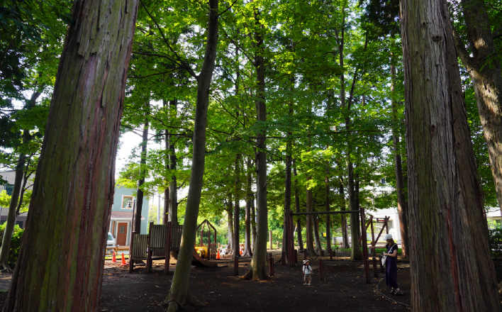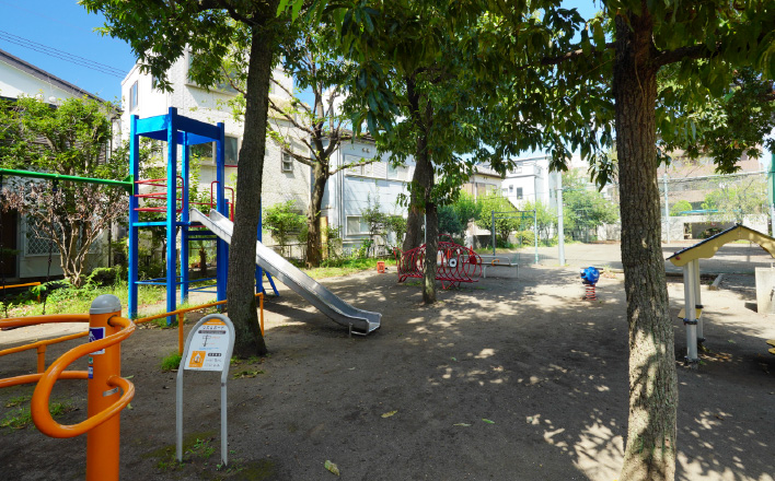 住宅街の一角に位置する、地域の人々に親しまれる公園。コンパクトながら遊具や樹木の潤いがあり、小さなお子さまが安心して遊べる環境が整っています。