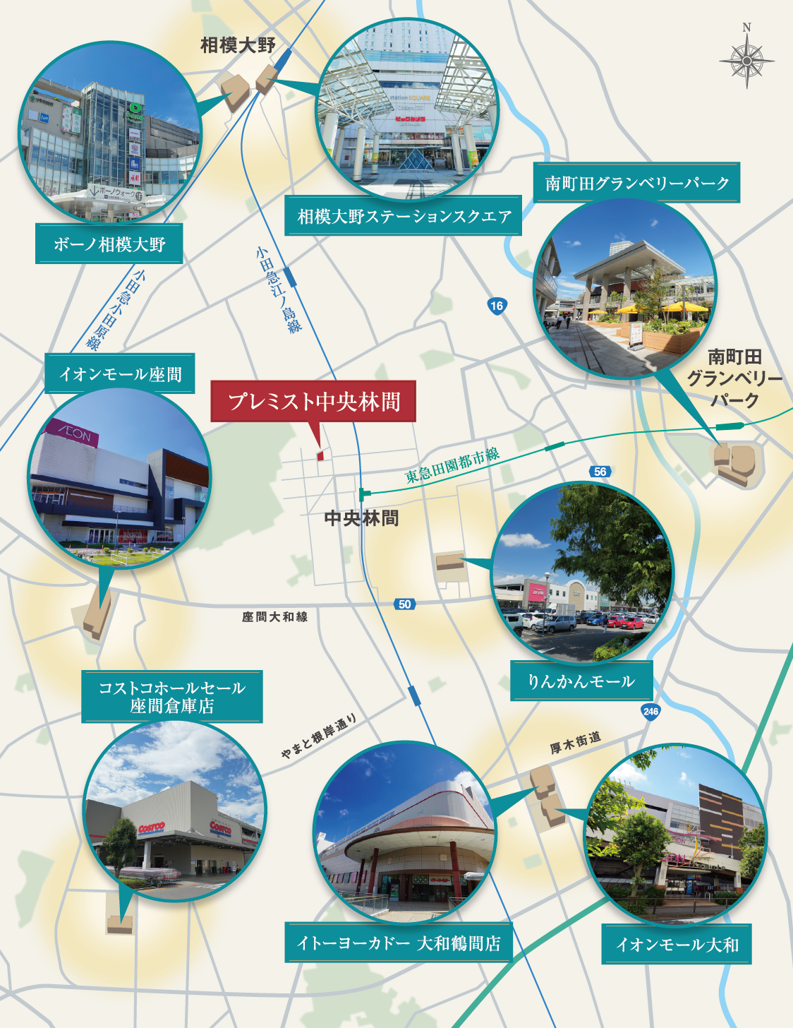 駅直結「エトモ中央林間店」(徒歩7分)、「中央林間東急スクエア」(徒歩7分)「小田急マルシェ中央林間」(徒歩5分)と徒歩圏に生活利便施設が充実。