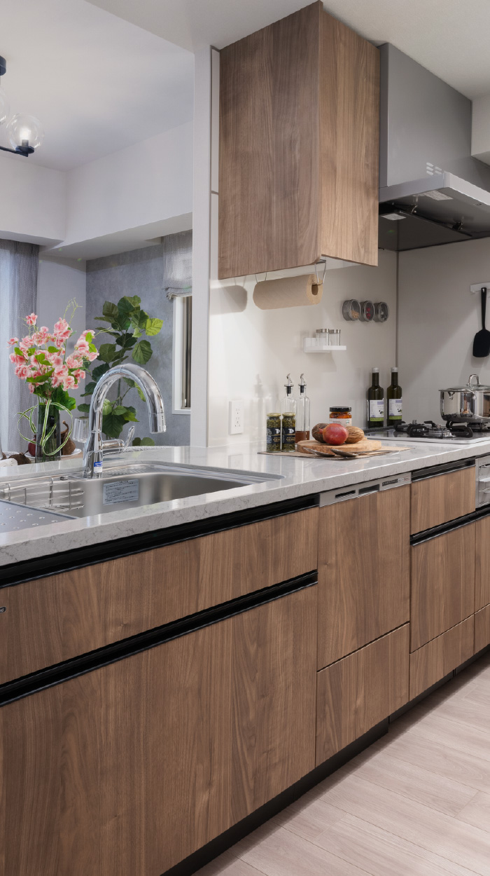 質感あふれる人造大理石をキッチン天板に採用しました。汚れが染み込みにくいので、毎日のお掃除もスムーズです。