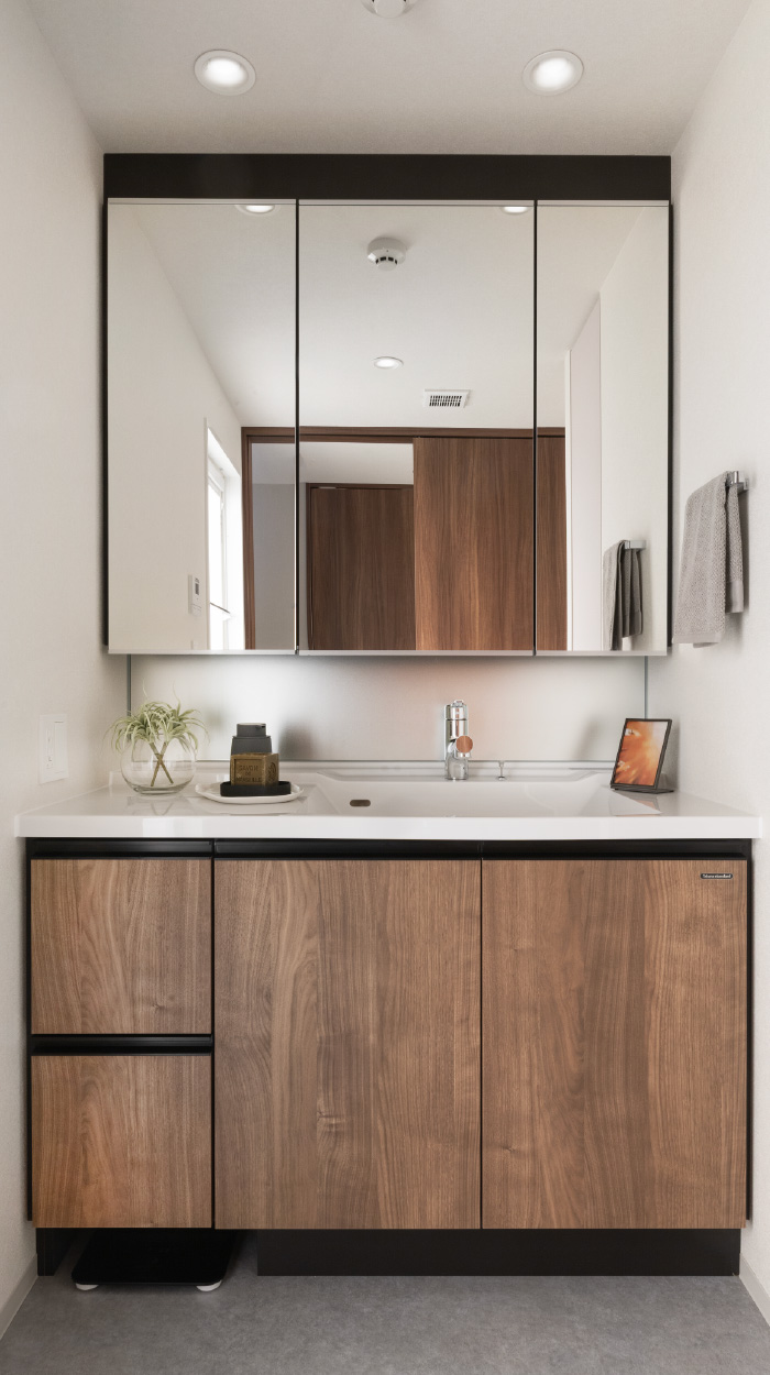 化粧品や身だしなみ用品など、パウダールームで使うこまごまとしたものを鏡の裏に収納できます。