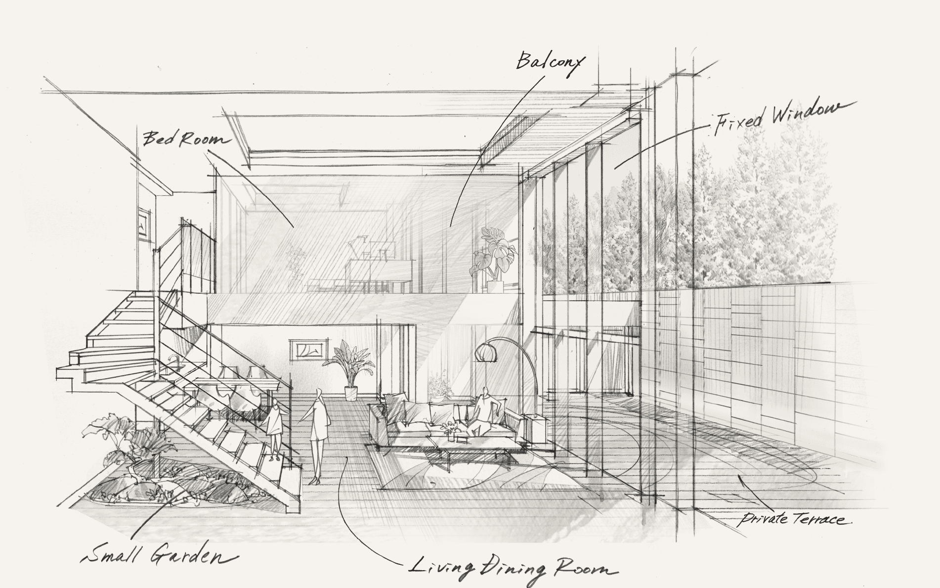 ※掲載のプライベートテラス(102号室)完成予想図は設計図書を基に描き起こしたもので実際とは多少異なる場合があります。植栽は、ご入居時の状況を想定して描かれたものではありません。また、竣工時には完成予想図程度には成長しておらず、形状、位置等は実際とは多少異なる場合があります。