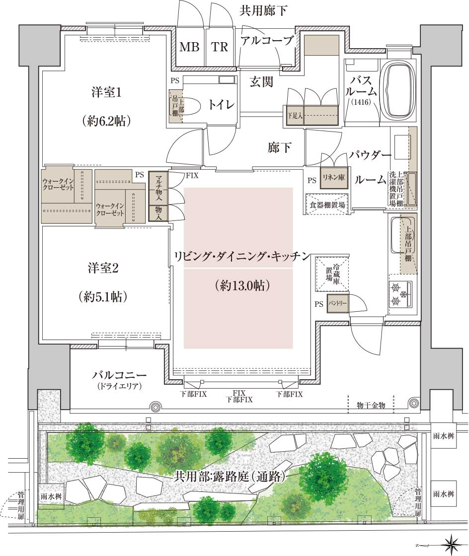※掲載の間取り図は設計図書を基に描き起こしたもので実際と多少異なる場合があります。梁や下がり天井は表現されておりませんが、居室に大梁による下がり天井が出ます。