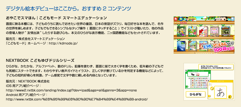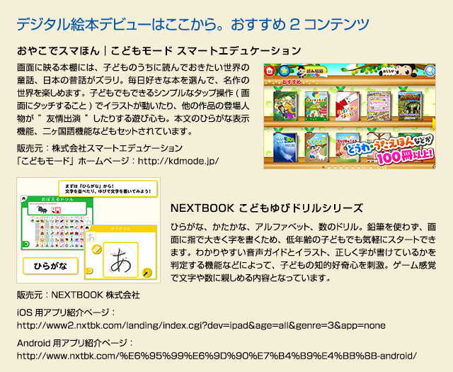 パソコンや携帯電話のある生活を当たり前として育つこれからの子どもは「デジタルネイティブ世代」であり、家庭でも学校でもさまざまなツールを使っていくことになります。デジタル絵本はその入り口のひとつとも言えます。