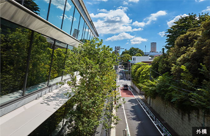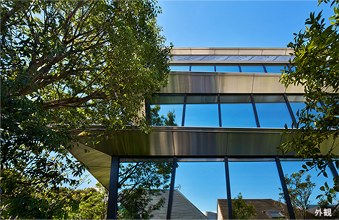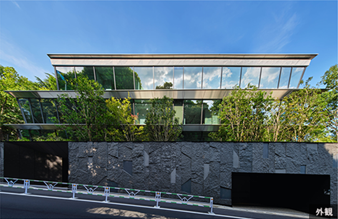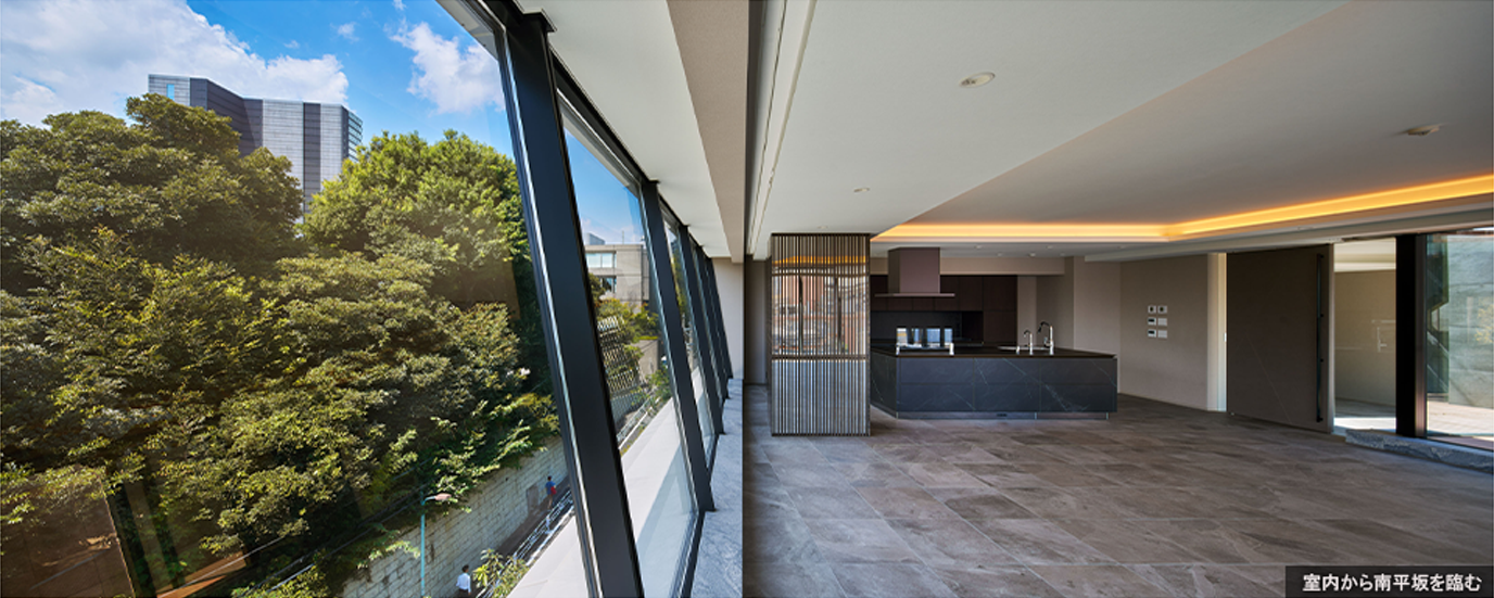 高橋:「先進性のあるファサードとして、特注のステンレスガラスサッシを南平坂に向けて斜めに傾けるデザインにしました。坂道を歩く人々には対面の緑を迫りくるように感じさせ、室内からは坂道を見下ろしたくなるような親近感が生まれることを目的としています。対面に建つ迎賓館の豊かな緑を鏡のように映して緑量を補完しながら、街に建物を溶け込ませるという2つの効果を実現させました。ここでもテーマ通り、敷地内外の緑地や街を映し出す薄い一枚の被膜で、プライバシーとパブリックの境界を試みています。建物外から見る姿と室内から見る景色にギャップを生ませ、この街に溶け込み、この街と一体となった、永く受け継がれる景観を目指しました」