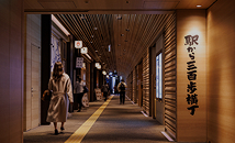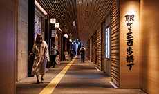 そのネーミングどおり、博多駅から歩いて300歩ほどの場所にある「駅から三百歩横丁」。2016年に開業した飲食店街で、焼き鳥、もつ鍋、海鮮、餃子、ピッツァなど福岡の名店10店舗が軒を連ね、昼飲みからディナーまで気軽に楽しめる全天候型屋台街。地下通路で濡れずにアクセスでき、ひとりでもふらっと立ち寄ることができます。