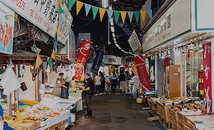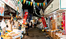 博多の台所と呼ばれ、100年以上福岡の食を支えてきた「柳橋連合市場」。全長100mのアーケードの通路を挟み、約35〜50軒の鮮魚店や精肉、青果、明太子・漬物などの小売店が軒を連ね、対面販売の威勢のいい博多弁が飛び交います。プロの料理人から一般家庭まで幅広く支持され、市場内には鮮魚直営の食堂やイートインも充実。福岡の食文化を感じられる活気あるスポットです。