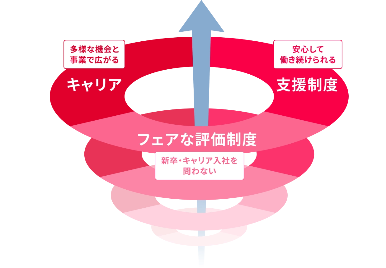 仕事を通じてさまざまなチャレンジができること。取り組んだことがしっかり評価されること。仕事だけでなくワークライフバランスも踏まえた支援制度が整っていること。これら3つの要素が作用することで働きがいの好循環を生み、一人ひとりの社員が、仕事を通じて得られる歓びや価値を高め続けていく。それが当社が約束する働く環境です。