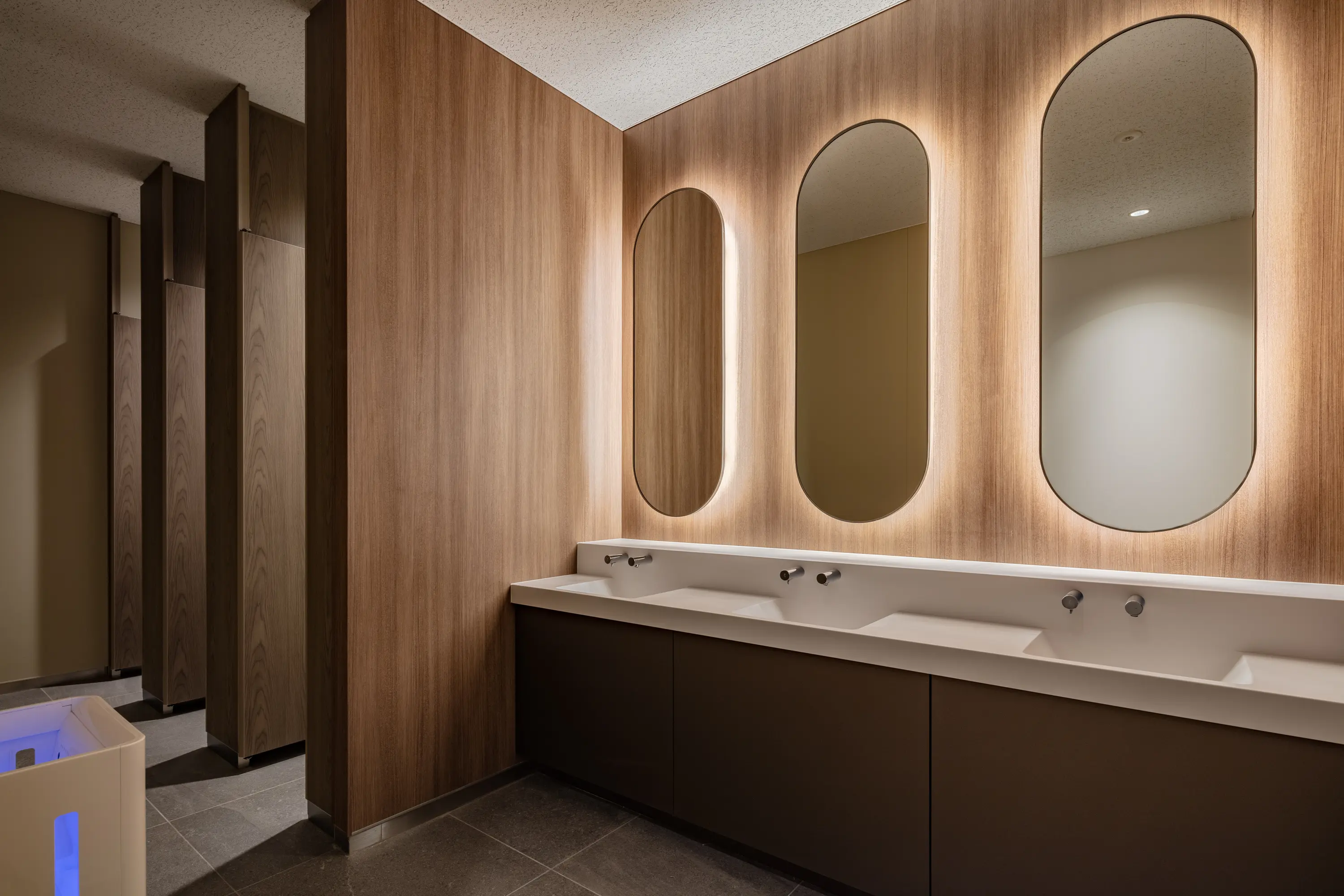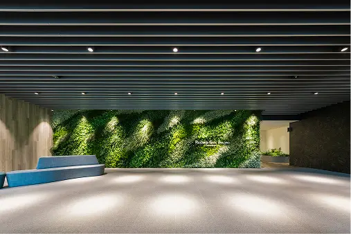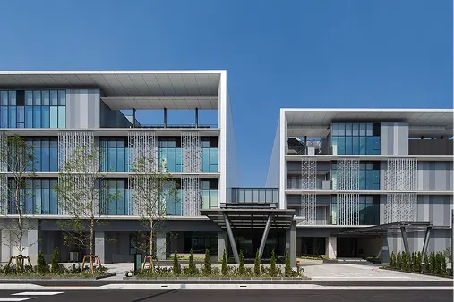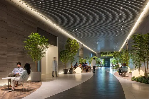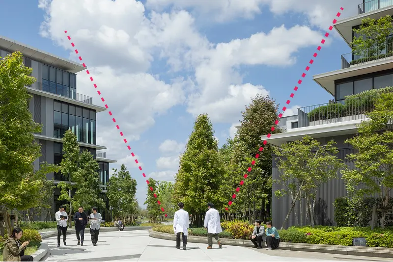 しかし、今回のプロジェクトは研究施設がその中心にある。セキュリティの問題が懸念される中、セキュリティラインを柔軟に3段階もうけることで、「まち」としてあるべき機能を確保。さらには緑豊かな植栽への日射を確保し、建物による圧迫感を抑えるため、下階よりも上階が後ろに下がっている構造(セットバック)を採用。それによって温かな日が差し、通行する人が開放的な雰囲気を感じられるプロムナードを実現した。