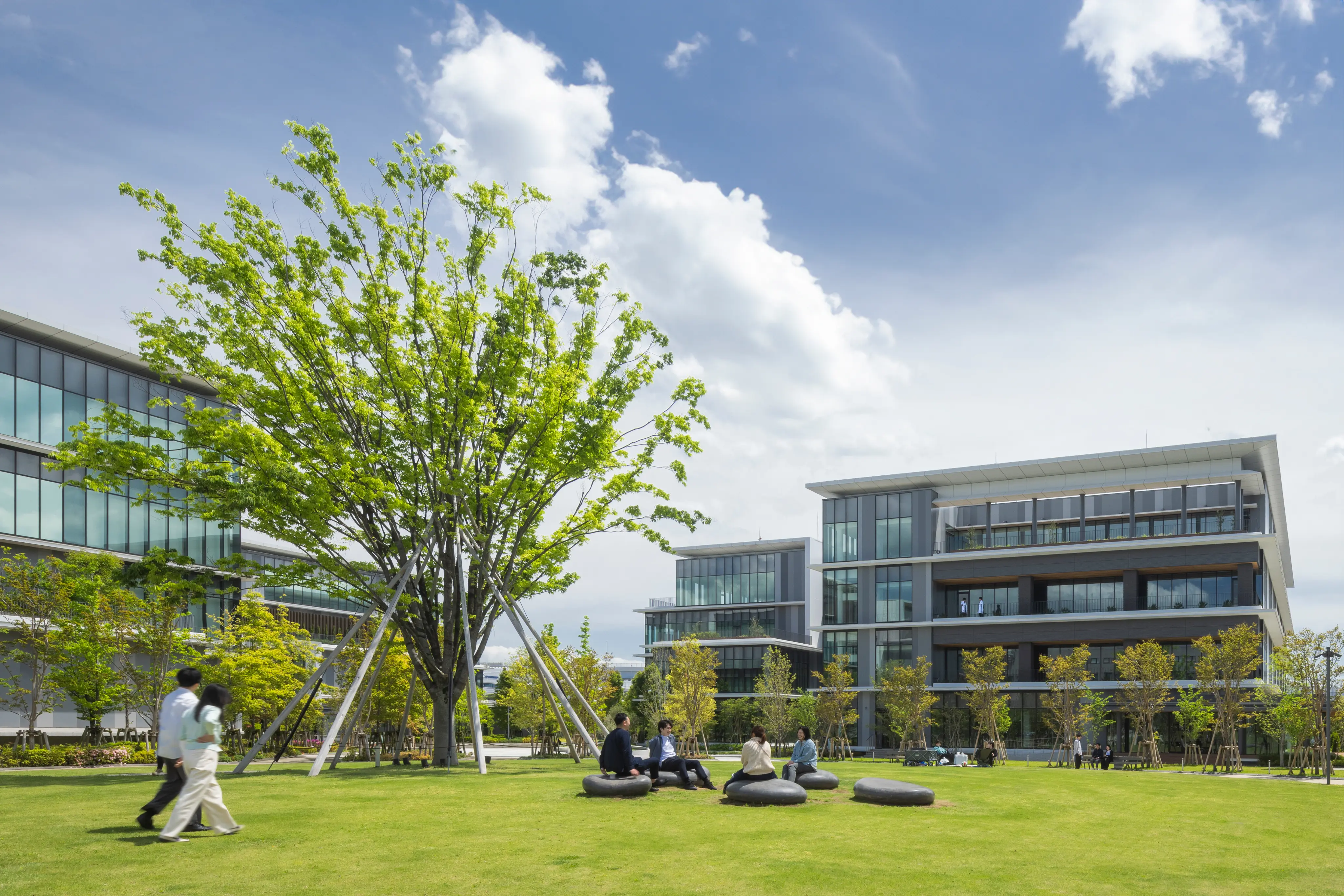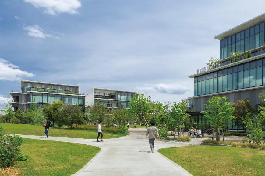 当初、近隣住民の方からあがった「工業団地のように敷地がフェンスで区切られ、各企業がどのような事業をやっているのかわからない」「無機質・無秩序な開発が進んでいくのでは?」という懸念。それがどうだろう。行政や住民からの声を丁寧にヒアリングし、そのオーダーに応えるだけでなく、超えるための提案を行ったことで、今では放課後、公園では子どもたちが遊んでおり、犬の散歩をする人もいる。そのすぐそばには、白い上着を羽織った研究者もいる。そんな多様な人が垣根なく混ざり合うまちこそ、開発当初から描いていたまちの姿だった。