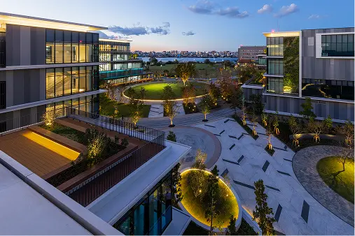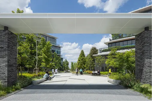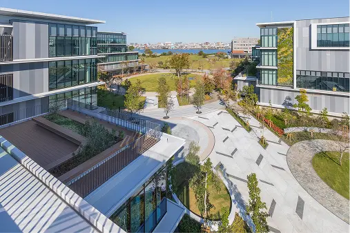 街区公園のフェンス撤去により敷地がシームレスにつながり、研究施設に憩いをもたらしている