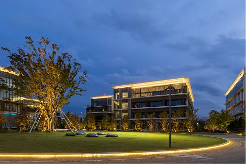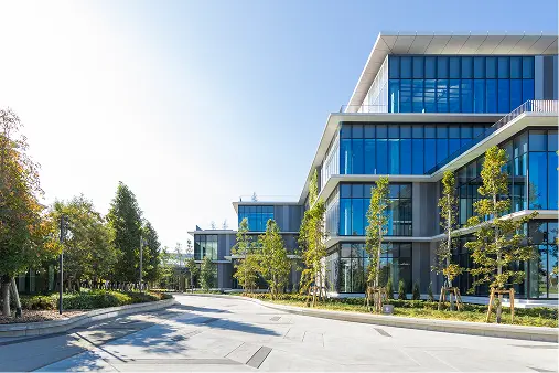 敷地の北西にあった公園と道を挟んだ向かいにある公園を一直線につなぐプロムナード(遊歩道)も形成し、各研究棟の1階にはコミュニティスペースやショールームをつくった。「オープンイノベーションが生まれるまちづくり」というテーマのもと、元々公園を取り囲んでいたフェンスを取り外すことを発案。行政に掛け合い、撤去することになった。敷地内とその外側との境界線をなくし、誰もが通過できるまちを実現した。
