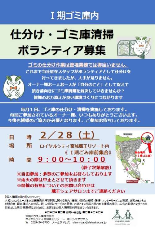 皆様こんにちは 昨年より実施しておりますゴミ庫清掃ボランティアに ご参加いただいているオーナー様、いつもありがとうございます。 今後もご支援、ご協力いただけますよう、よろしくお願いいたします。 今月はⅠ期ゴミ庫清掃となっております。 他エリアのオーナー様によるご参加もお待ちしております