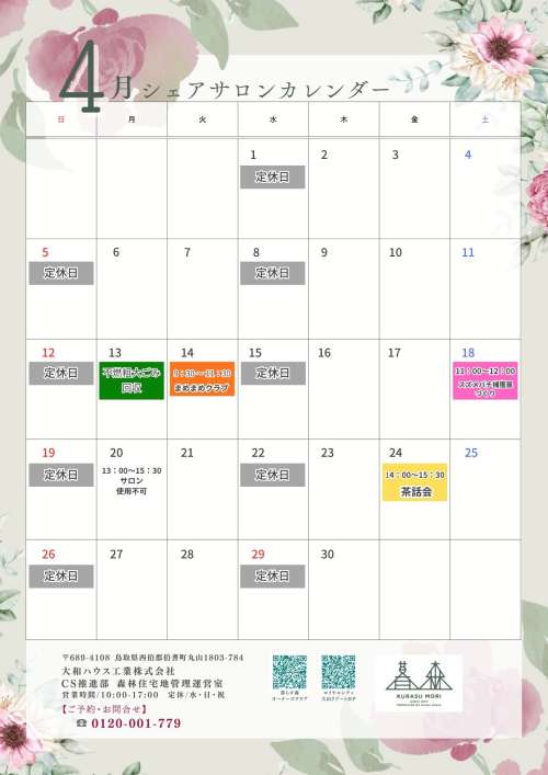 ≪ 予約受付・お問い合わせ ≫ 大山シェアサロン TEL:0120-001-779 営業時間:10:00 - 17:00(水・日・祝 定休)