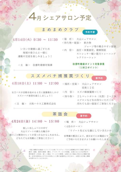 いきいき健康に過ごすために 地域の皆さんと一緒に、運動や交流を楽しみましょう! < 日 時 > 4月14日(火) 9:30-11:30 < 場 所 > 大山シェアサロン <内容> 血圧・体重測定、健康相談 ストレッチ・軽い筋力トレーニング レクリエーション <主催> 伯耆町健康対策課 伯耆町健康ポイント対象事業(1回2ポイント) 【スズメバチ捕獲罠づくり】 要予約