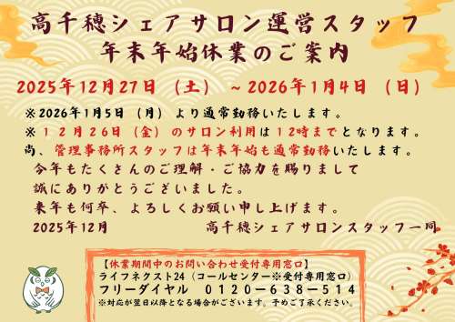 勝手ながら、下記の期間中は「シェアサロン」を休 業させていただきます。