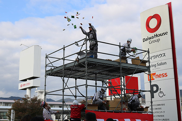 地域共生推進委員の田中は「案内チラシを配る前に、お客さまから『去年の祭りがとても良かったと聞いたんですが、今年はいつですか?』とお電話をいただいたんですよ」と活動が着実に地域へ浸透してきている手応えと取り組みの広がりを感じたと言います。地元テレビ局からも問い合わせが入り、番組内の餅まき情報コーナーで紹介されるなど、地域の行事として親しまれる存在へと育ちつつあります。